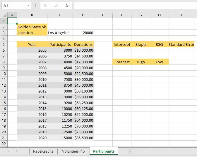 This year you have decided to use Excel to calculate frequency distribution by age and time calculate various descriptive statistics and forecast participation rate as well as donation rate for. You are a volunteer for the Golden State 5k an annual 5k held across several cities in California to raise money for at. Exp19_Excel_Ch08_Cap_Golden_State_5K State_5K Exp19_Excel_Ch08 Exp19_Excel Cap_Golden Exp19 Excel Exp19ExcelCh08CapGoldenState5K Golden.